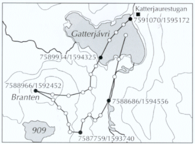 Kurt Eskos spårlogg från Branten nära Gatterjövri. De två talen på var